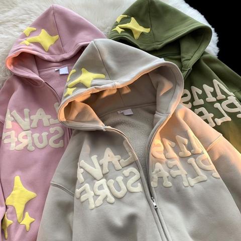 YY056 Heavyweight Oversized Stringless Distressed Y2K Streetwear Custom 3D Puff Printing Vintage Zip up Hoodie